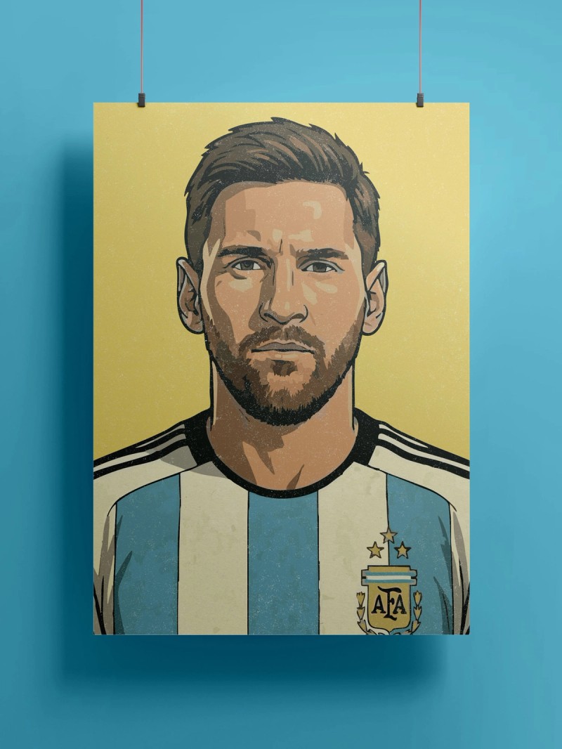El talentoso 10 en una composición frontal limpia y elegante que resalta el carácter del futbolista argentino, destacando la serenidad, liderazgo y genialidad del capitán que marcó una era en el fútbol mundial.