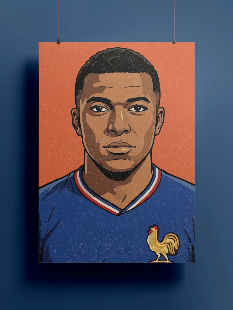 Resalta la determinación y el carácter del delantero que redefinió la velocidad y el poder ofensivo en el fútbol moderno. Con la camiseta de Francia y una mirada firme, simboliza a la nueva era de campeones mundiales.