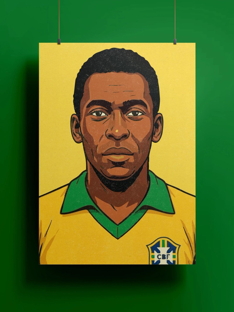 "O Rei" del fútbol mundial. Con la camiseta clásica de Brasil y una expresión firme, la obra transmite historia, grandeza y legado eterno.